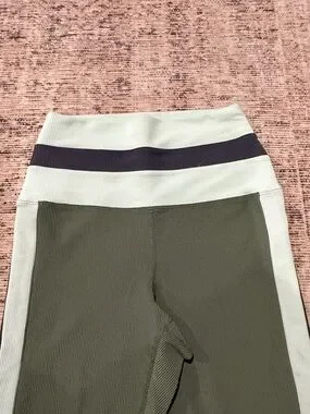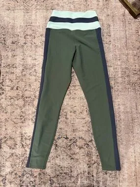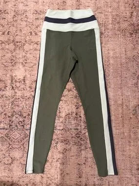 High-waist athletic leggings. Olive green body with white side panels and navy trim. Stretchy, smooth performance fabric. Sleek sporty silhouette for workouts or casual wear.