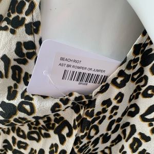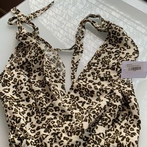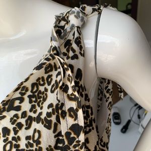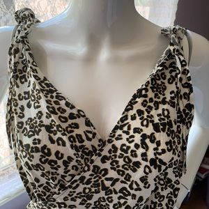 Plunging front and back necklines, shoulder tie, elastic waist. Ivory color background with black and gold leopard print. Size is not on garment