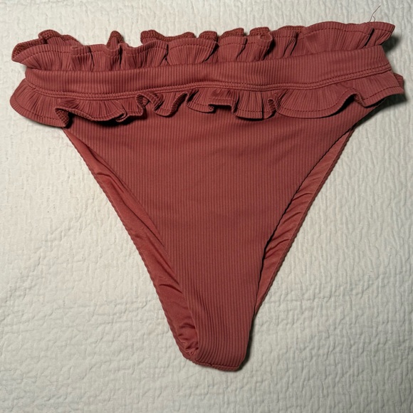 Have two of these do don’t need it. Chic ruffled bikini bottom. Features a stylish rust color. Perfect for beach days.
