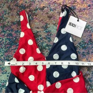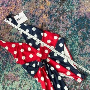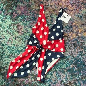Beach Riot Samira One Piece Swimsuit with tie front in blue and red with white polka dots.