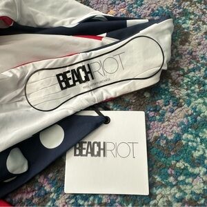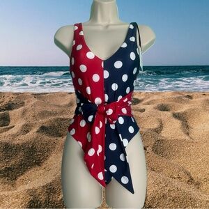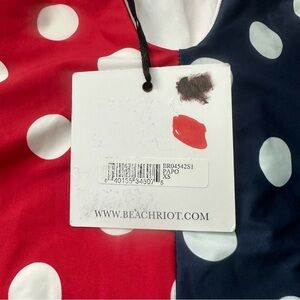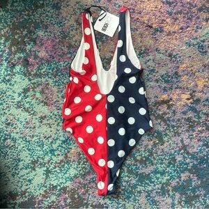 The Samira One piece is Beach Riot's new one piece that has a low back and a flirty tie around the waist. In a two tone patriotic polka dot print with red on one side and navy on the other. Nylon/Lycra blend Hand wash cold; lay flat to dry Made in the USA