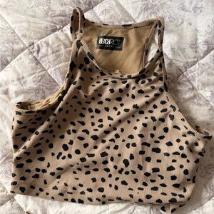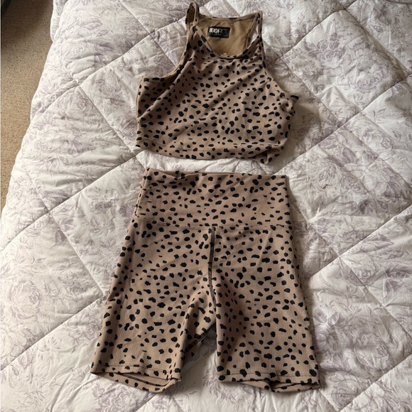 Chic ribbed athletic leisure set by Beach Riot. Features a bold leopard pattern in tan and black.