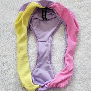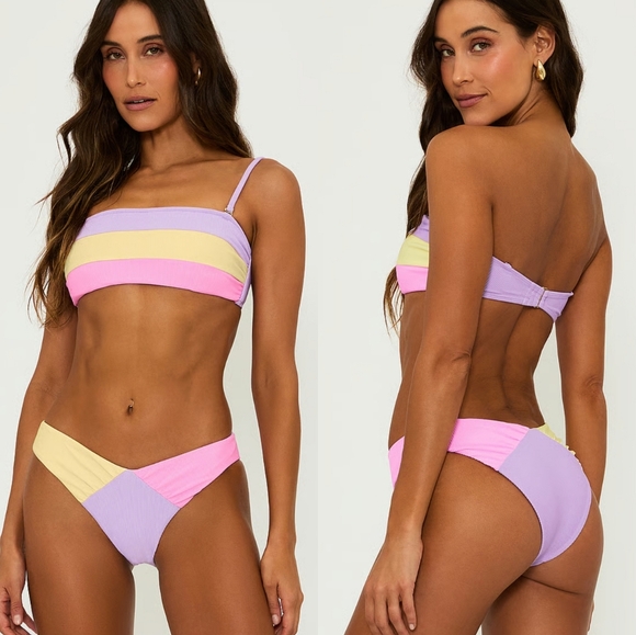Chic pastel bikini by Beach Riot. Features soft purple, pink, and yellow hues. Perfect for poolside elegance.