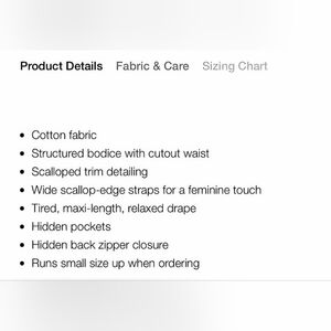 Chic strapless design. Scalloped detailing. Flowy and elegant with pockets. Upsize to xl but my double d's prevents me from zipping up the back. Smaller chests should fit.
