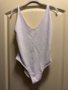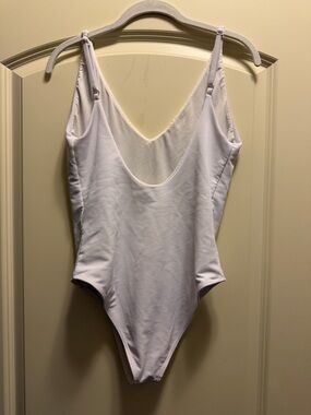 Simple white ribbed one-piece with a deep V-neck. Thin shoulder straps and sleek silhouette. Stretch fabric for comfy fit. Minimal, versatile swim staple.