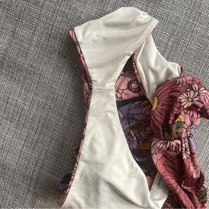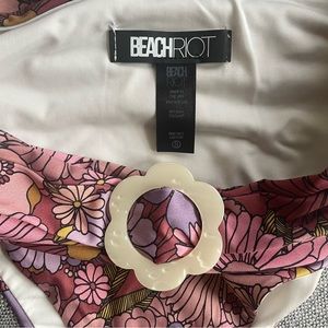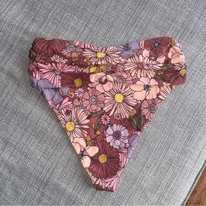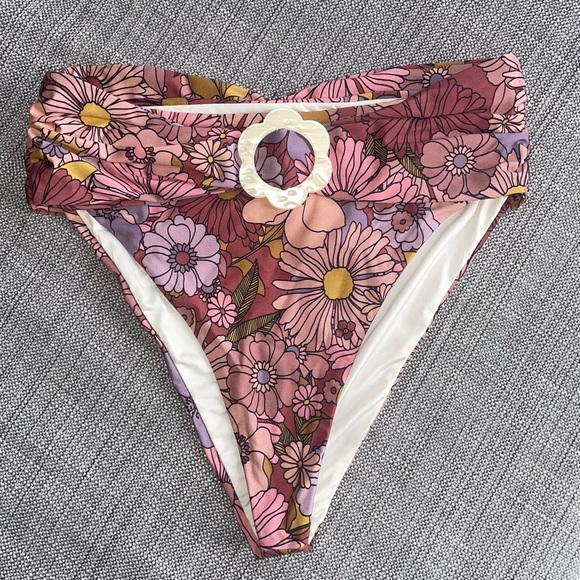 Marsala. Size small. High waisted. Excellent condition. Belt has a cream flower. Flower print in purple, pink and other colors. Soft material. Stretchy. Would go nice with any cream bikini top or any of the other colors seen on the bottom. No longer sold.