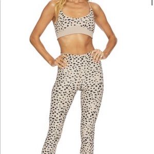 Shawn is a sporty bra top featuring spots on extremely comfortable ribbed fabric and crossed adjustable straps. Pair this top with the bike short in Taupe Spot to complete the set.