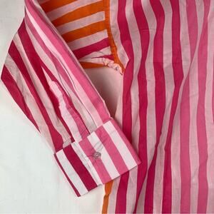 This vibrant button down shirt features bold pink and orange stripes that create a lively and eye-catching appearance. The long sleeves and relaxed cut make it a comfortable choice for warm weather, while the lightweight fabric adds to its versatility as a layering piece.