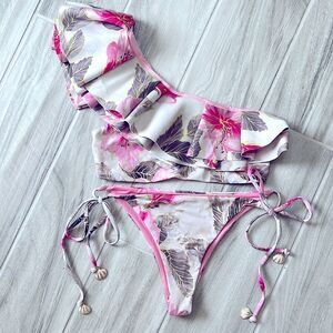 Beach Riot Bikini One Ruffle Shoulder With Shells Detail Ties Pink Gold Flower Large sells as set.