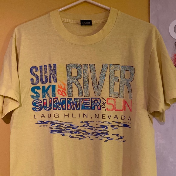 A beach shirt from Laughlin, Nevada “sun, ski, beach, River, summer, ski, fun” lettering on front size large