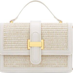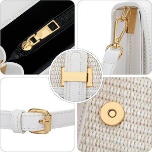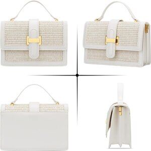 Features: Stylish straw design with a white PU leather top handle and adjustable strap. Versatile as a crossbody, shoulder bag, or cute clutch. Fits essentials like your phone, keys, makeup, and cards — ideal for trips, beach days, or casual outings.