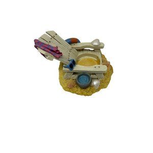 This beach themed item, a Decorative Beach Chair Tea Light/Votive Candle Holder, is in excellent preowned condition. It is resin, made to look look like a sand base with a beach chair, beach towel, sun glasses, life ring & towel, sand bucket & sea shells. It was purchased from Kohl's, so good quality. It is 3 inches high, including the glass candle holder, and 4 inches wide.
