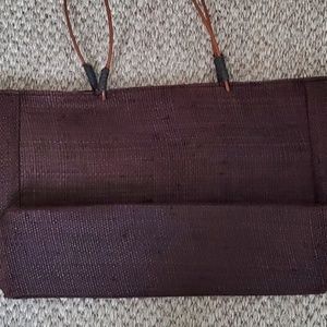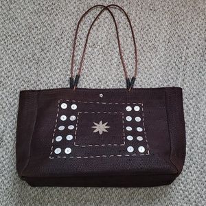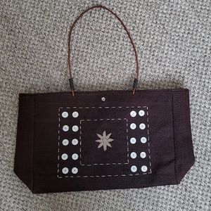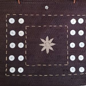 Dark Brown/Black Raffia Beach tote with shell button embellishment. 20" W when flat, 11.5" H, 5" Bottom depth. 12" strap drop. Natural woven, large capacity tote for beach or shopping..