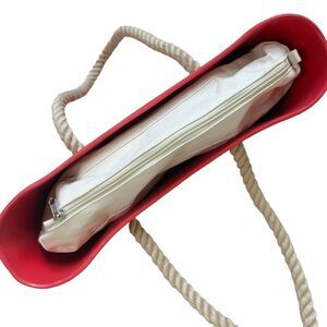 Red Rubber Canvas Lined Beach Tote with braided rope handle