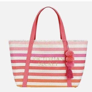 Victoria's Secret Tote Bag, 18x12 inches, shoulder bag comfortable, big space for beach, park or city trip, colors White, pink, orange striped with gold lettering Has pom poms :) Pre-own, good care condition, some stains, clean, from smoke and pet free home. All reasonable offers accepted. please check the pics!