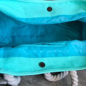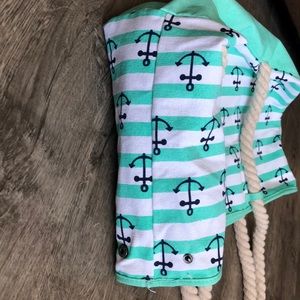 Mint green and white stripped beach bage with navy blue anchors with rope twisted strap. Water safe inside material with one zip pocket on the side.