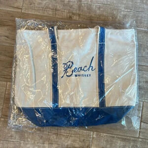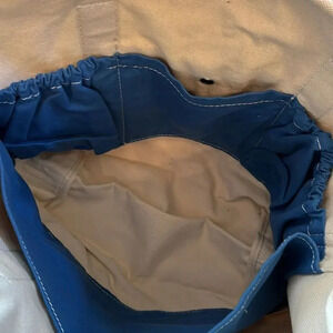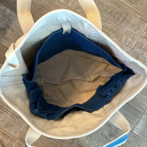 Item: cream and blue beach bag tote with pockets and sturdy material/strap
