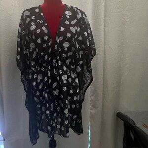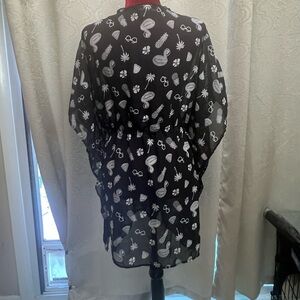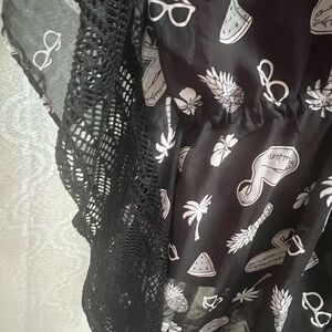 Black and white. Semi-sheer. Covered in cute tropical items such as watermelon wedges, sunglasses, flamingo floaties, palm trees, pine apples and hibiscus flowers. Smoke free home.