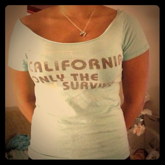 Adorable, off the shoulder, pal blue top that's a large for petites but it fits for girls who usually are a size 0 or 1