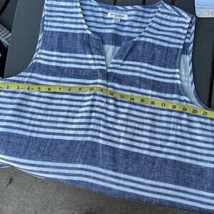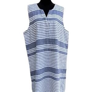 Beach lunch lounge collection striped dress, XL. 55% cotton 45% linen.. chambray blue with white stripes, sleeveless with a V-neck opening. Length of dress is 37”. Lined. Linen cotton blend fabric.