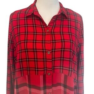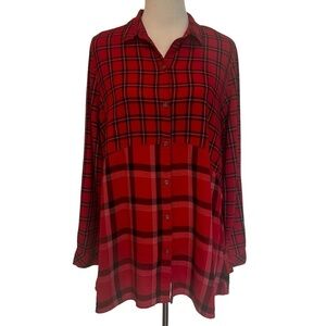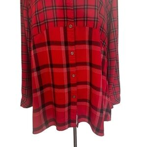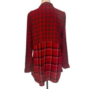 Mixed print beach lunch lounge red, black and white plaid long sleeve, rayon button front shirt in great condition. Longer line hem loose fitting style. Features