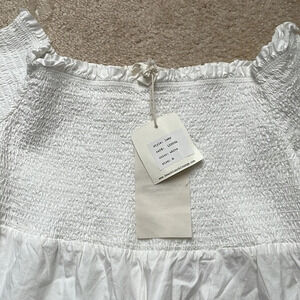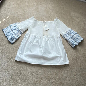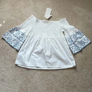 NWT Beach Lunch Lounge top Off shoulder Size medium White and blue Smocking on top Bell sleeves
