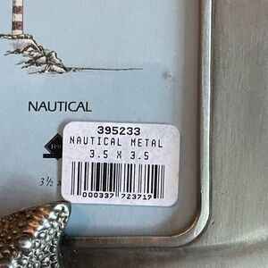 Beach decor picture frame square 6.5” picture size 3.5” square. Silver matt metal sand with starfish and shell in bottom left corner. Heavy, NWT