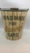 Metal tin beach pail has written on it “I was Made For Sunny Days” in blue & yellow.