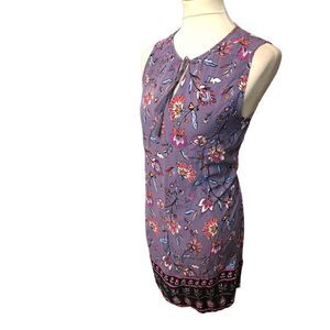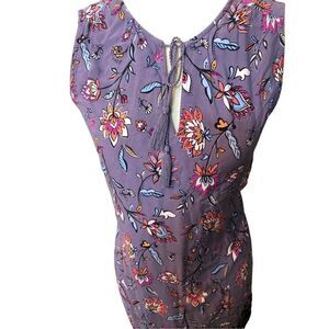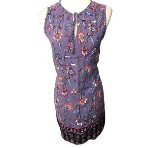 Beach Lunch Lounge purple floral patterned purple shift dress Size M. Has tassel tie at neck line to create keyhole opening. Pullover shift dress, lightweight. Could use as bathing suit cover up. Sleeveless.