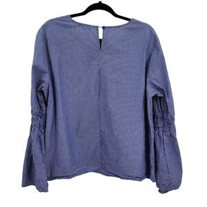 Beach Lunch Lounge Top Smocked Bell Statement Sleeve Railroad Striped Blue Sz XL