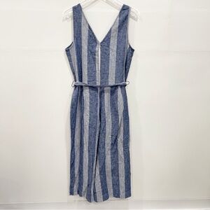 BeachLunchLounge Blue Stripe Wide Leg Jumpsuit Belted Cotton Linen Medium