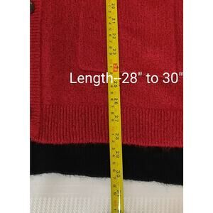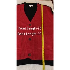 Previously Owned Cardigan Sweater by Beachlunchlounge. Red on front, Black on back. Long Sleeves, V-neck. Pockets on front. A little longer in back than Front. Lightweight for a sweater.