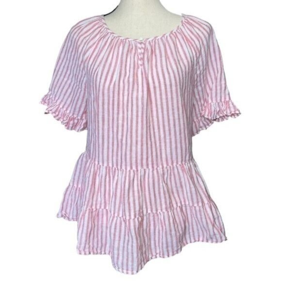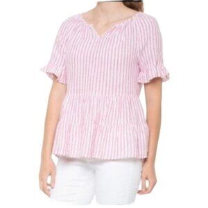 BeachLunchLounge Peplum Top Womens M Pink White Stripe Linen Blend Ruffle Sleeve