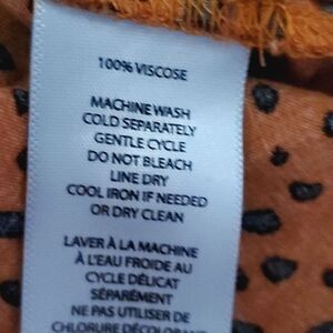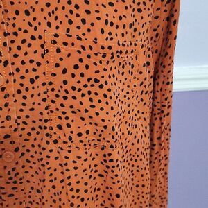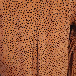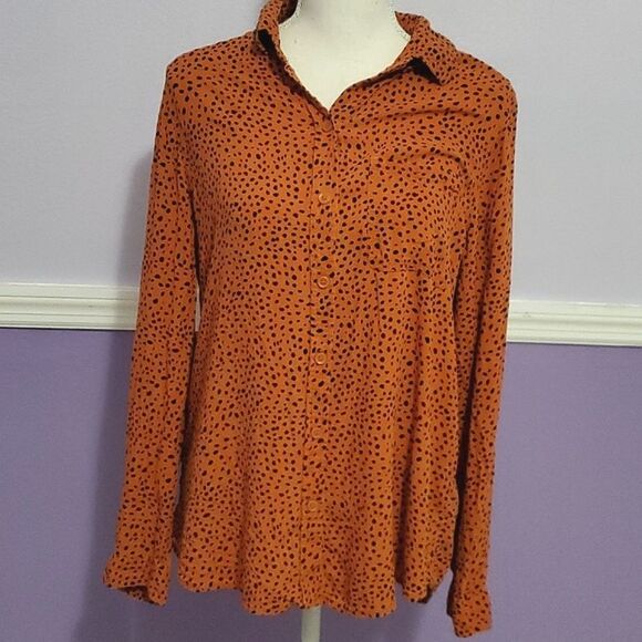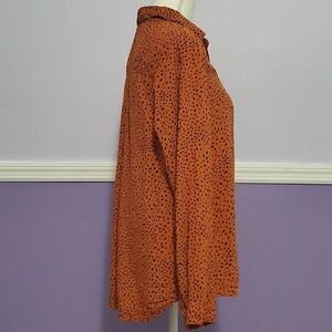 Rust button down shirt with black spots print. One pocket on the chest. Long sleeves wuth buttoned cuffs. Rounded high low bottom hem. 100% rayon.