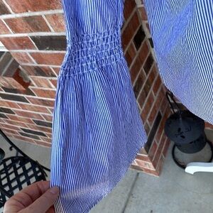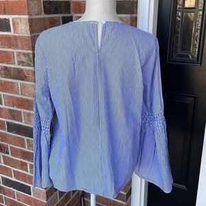 BeachLunchLounge Top. Blue and white stripe 100% cotton, excellent condition no stains or rips. Sleeves are smocked at elbow and bells out. Size Medium, P2P 21”, length 24”, sleeves 23”