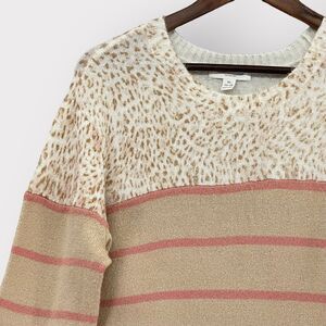 BeachLunchLounge Sweater Women XL Beige Animal Print Knit Long Sleeve Stretch Side Hem Slit