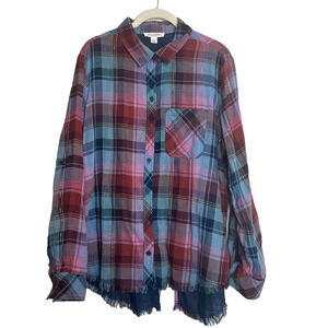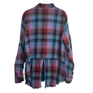 BeachLunchLounge Womens Button Up Shirt Large Blue Pink Plaid Frayed Hem Cotton