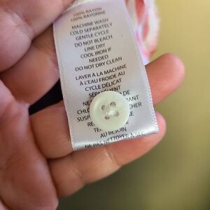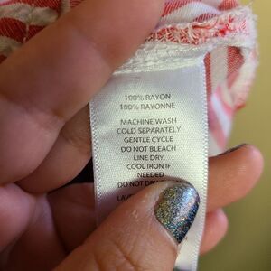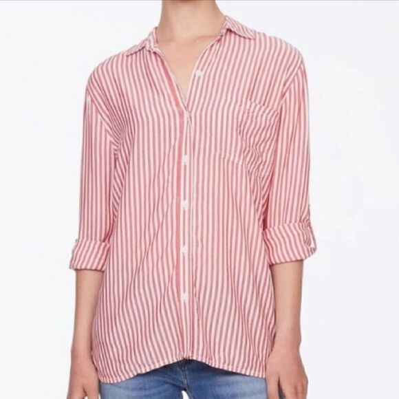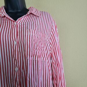 This is a long sleeved button up shirt by BeachLunchLounge. It is red and white and has an extra button sewn on to the inner tag. On the chest is a small pocket.