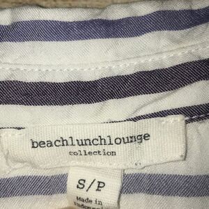 Great, preloved condition. BeachLunchLounge Striped Button Front Blouse. Longer length, slightly oversized tunic length. Blue and white stripes. Front chest pocket. 100% viscose.