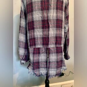 Beach lounge flannel shirt. Frayed bottom. Slit in the back tail.