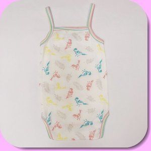 This organic cotton Beachbody in a baby bird print is sleeveless and is perfect for layering. Has snap closures for easy diaper changes.