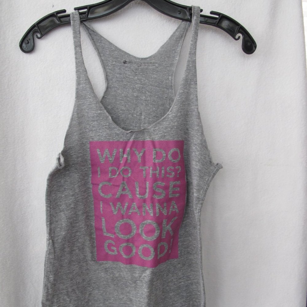 Great preloved condition - Beachbody brand women's tank - Size Small. Gray with Why Do I Do This Cause I Want to Look Good print front. Racerback style loose fit exercise tank. 50% polyester/38% cotton/12% rayon.