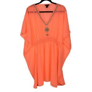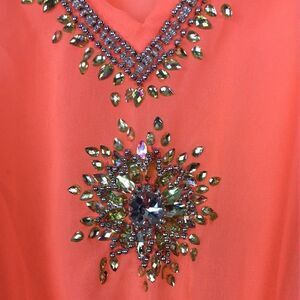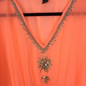 Orange bathing suit coverup. V neck with silver jewels around neckline and large flower like cluster in the middle of the bodice. Raglan sleeve with slight elastic around the bodice.