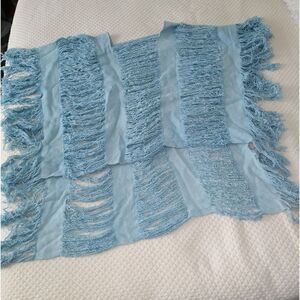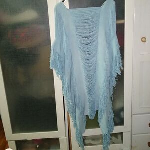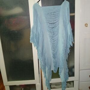 Baby blue cotton BOHO cover-up, fringed top with shredded details, 22" long on front, 29" back, 27" wide, swim