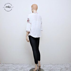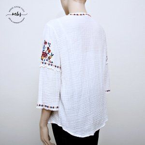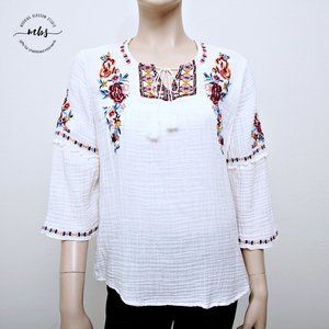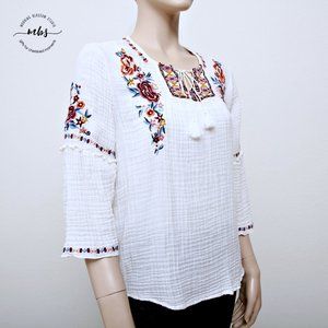 Beachlunchlounge Embroidered Floral Boho Tassel Neck Tie Cotton Blouse
