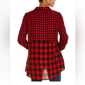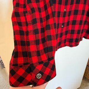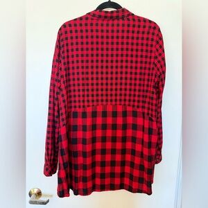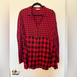 Long sleeve button down blouse in size XL. Black and red print. Collar. Like new condition. Button still attached to inside tag.