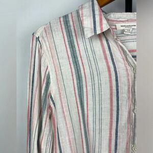 Beachlunchlounge White Multicolor Linen Blend Button Up Striped Long Sleeve Top