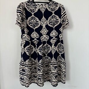 Beautiful navy blue and cream design, no pockets, tassels that tie, no material tag, new with tags!