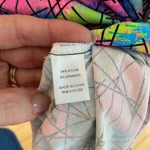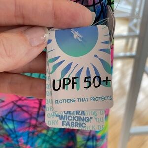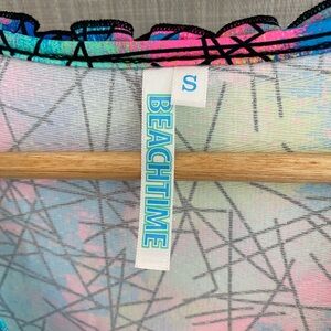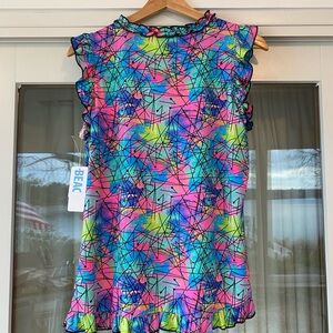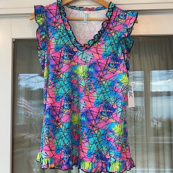 Beachtime UPF50+ Abstract Ruffle Top. Size Small. NWT. Vibrant top with abstract design and ruffle details. Features a mix of pink, blue, green, and yellow colors. Feel free to ask me any questions.