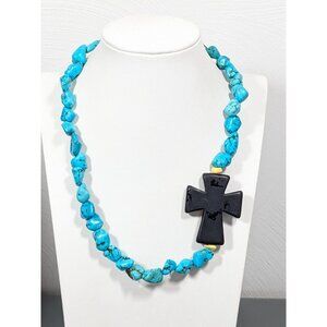Beachy Coastal Blue Stone Faux Turquoise Black Cross Necklace Bold 20 in